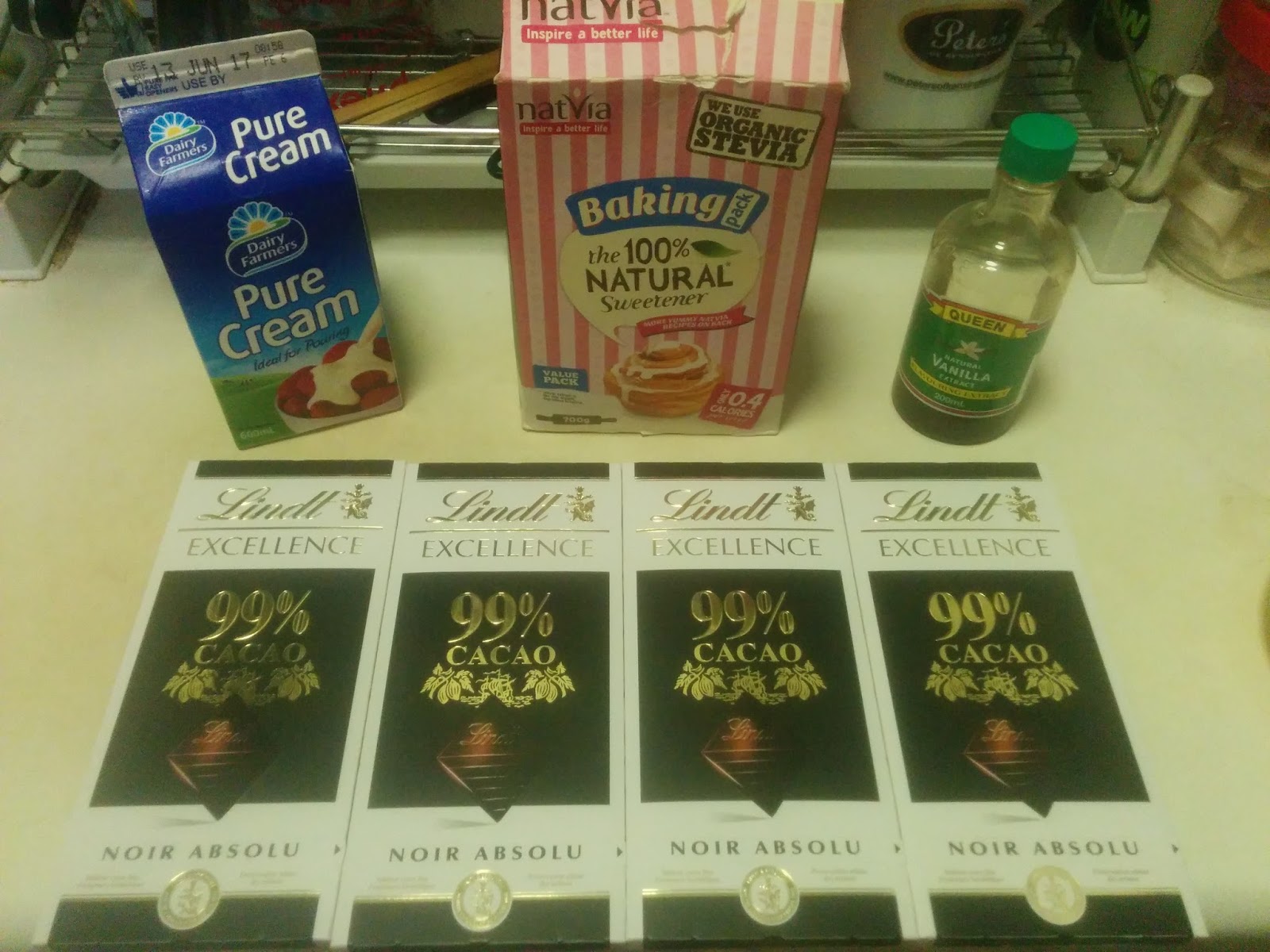 Method: Break the chocolate up and pop them into a microwavable container, pour the desired corresponding amount of cream, add sweetener and vanilla extract. Microwave in a standard 1000w microwave oven in 30 second intervals stirring/whisking the mixture in between. After a total heating time of 4 minutes a final 2~3 minutes should be spent whisking till a smooth consistency is achieved.